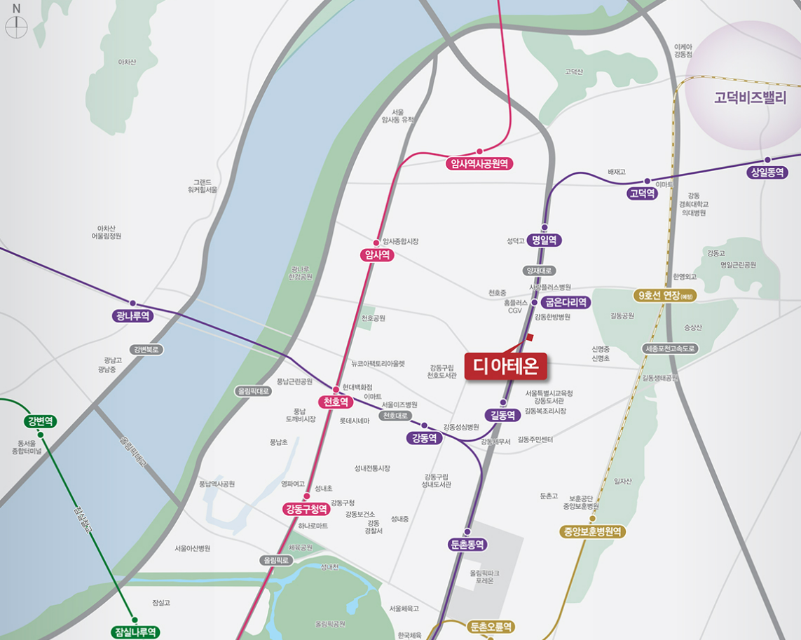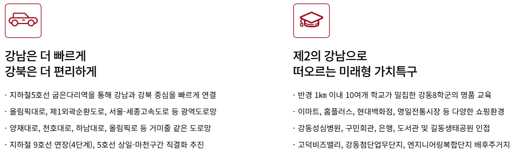 - 강동 생활권의 중심 입지로, 풍부한 상업·의료·문화 인프라 확보