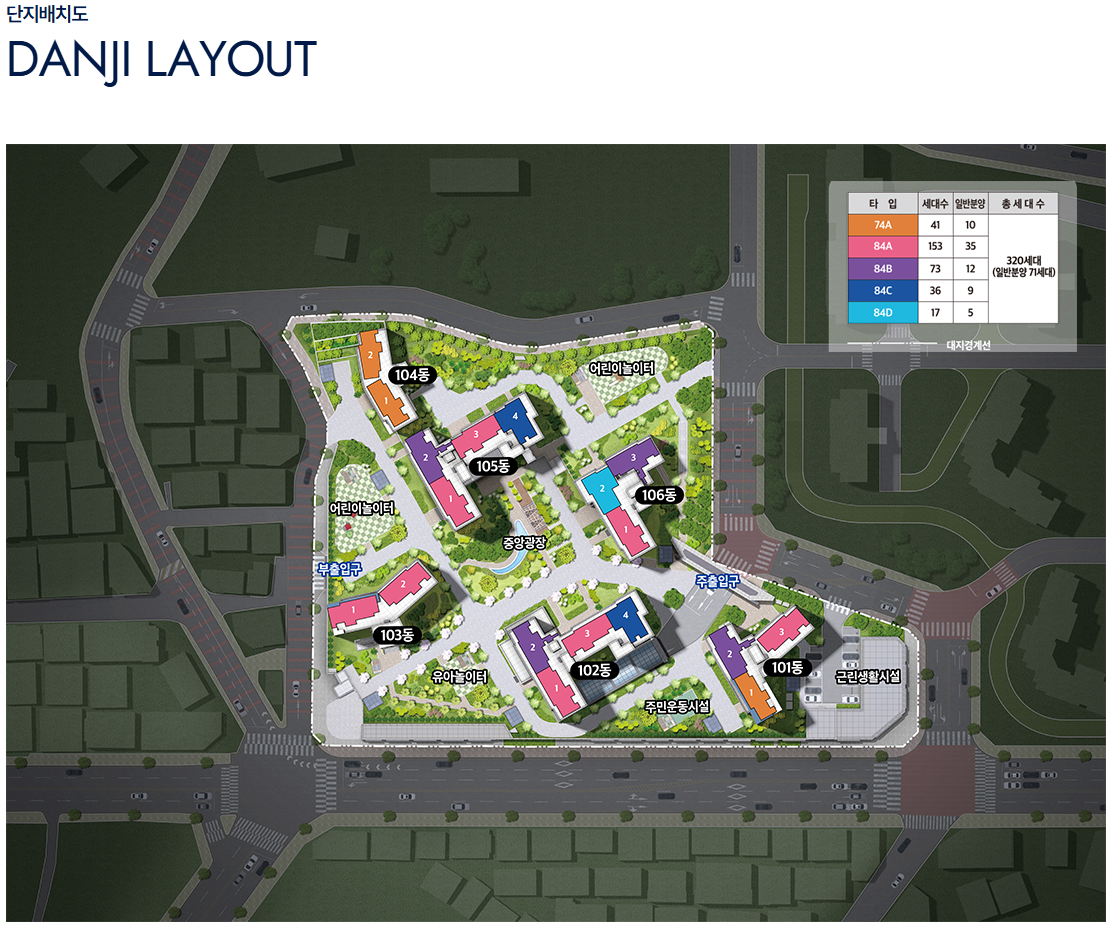 | 규모 | 지하 3층 ~ 지상 20층, 아파트 6개동 / 총 320세대 중 일반분양 71세대 |