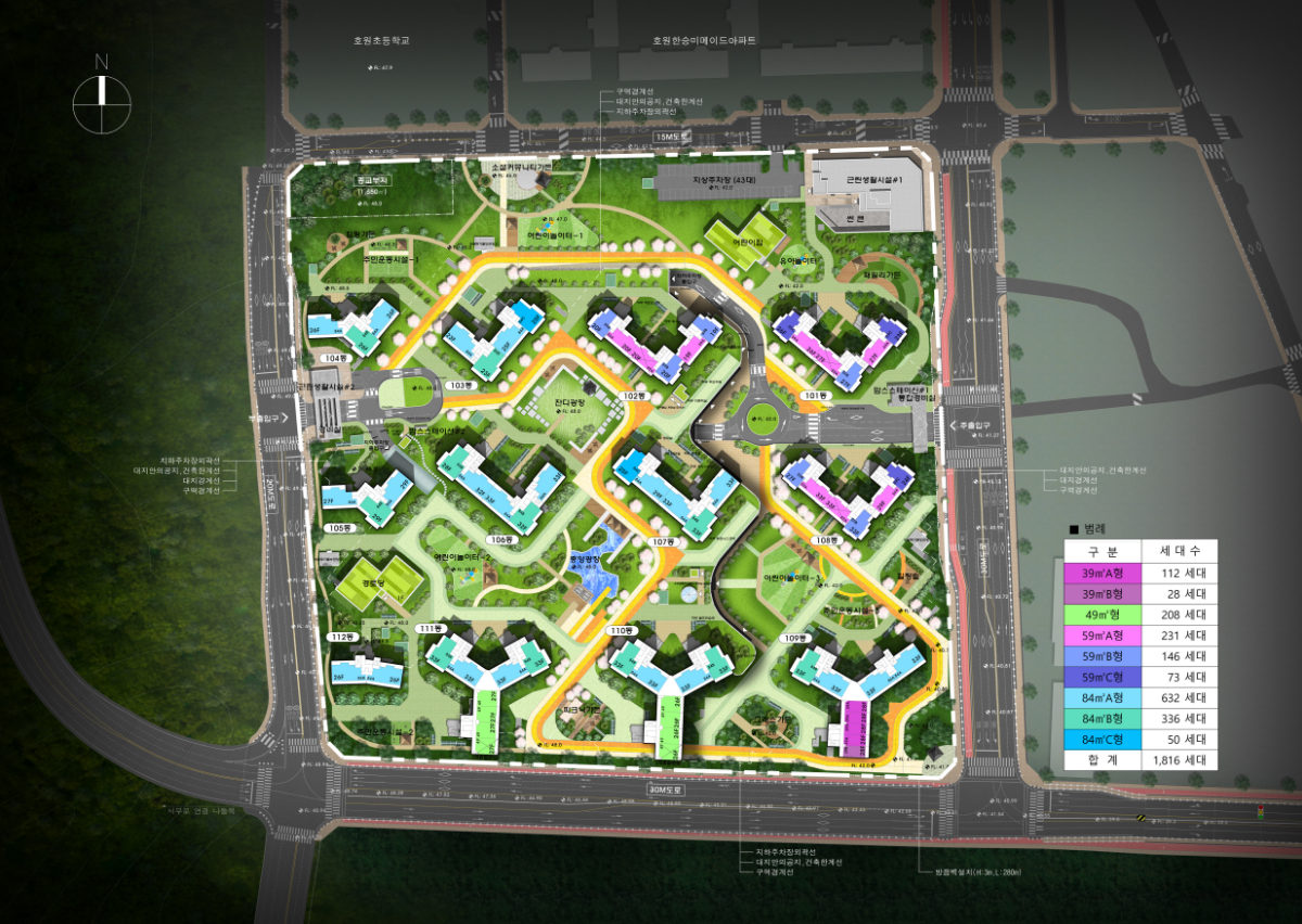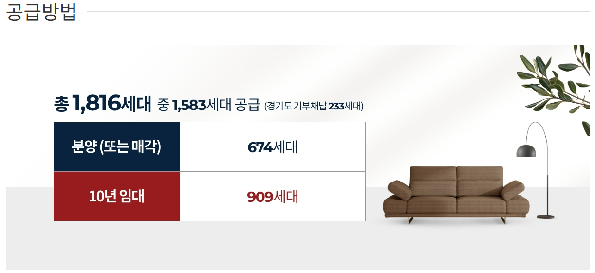 | 세대수 | 총 1,816세대 중 일반분양 674세대, 임대 909세대, 기부채납 233세대 |